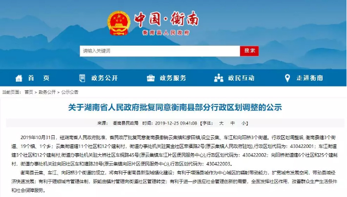 省政府批復(fù)同意!衡南縣設(shè)立云集、車(chē)江和向陽(yáng)橋3個(gè)街道