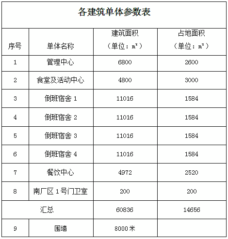 采購項(xiàng)目內(nèi)容包括:管理中心、食堂及活動中心、倒班宿舍(暫定四棟)、餐飲中心、南廠區(qū)門衛(wèi)室、圍墻立面概念設(shè)計(jì),各單體參數(shù)如下表: